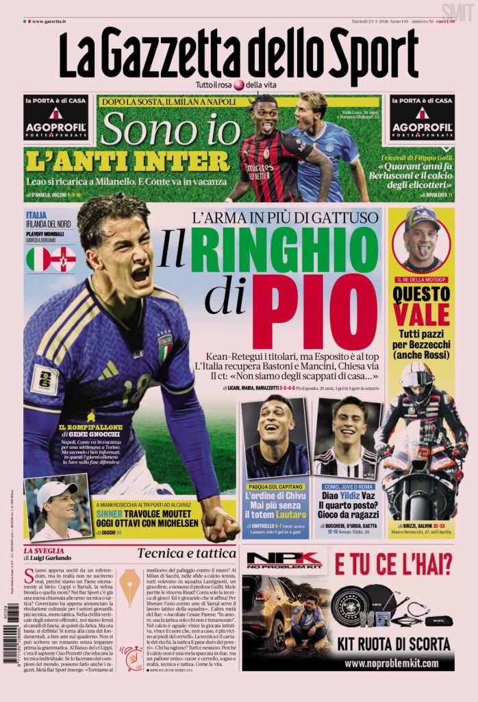Le prime pagine sportive del mattino consegnano un panorama ricco di temi, polemiche e aspettative. Al centro della scena c’è l’Inter, tirata dentro al dibattito sugli arbitri e sul peso degli episodi in campionato, mentre l’Italia si prepara alla sfida con l’Irlanda del Nord aggrappandosi all’entusiasmo di Pio Esposito e alle scelte di Gattuso. Attorno, si muovono anche Napoli e Milan, tra ambizioni di vertice, valutazioni tecniche e scenari che possono incidere sul finale di stagione.